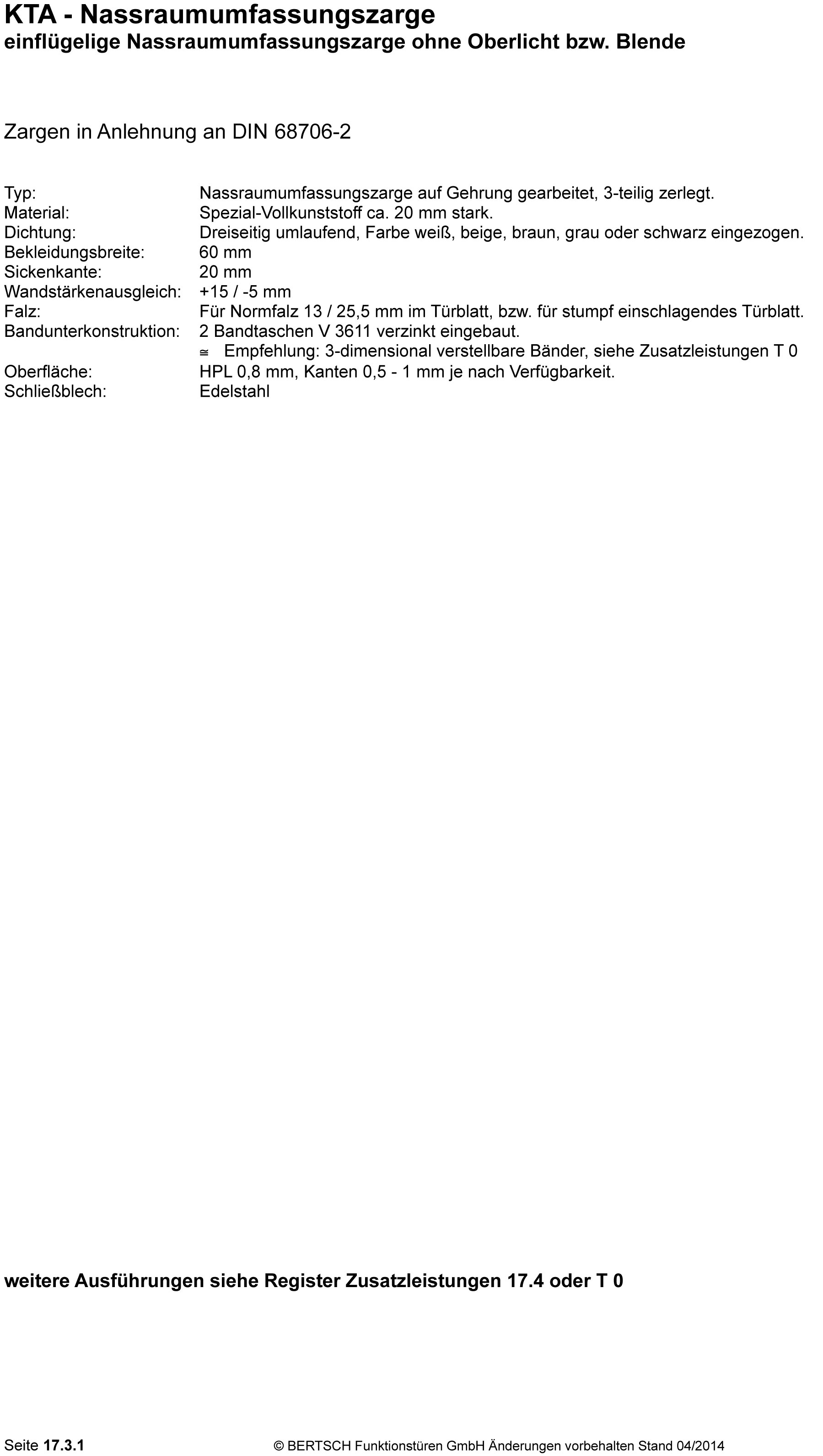 einflügelige Nassraumumfassungszarge ohne Oberlicht bzw. Blende