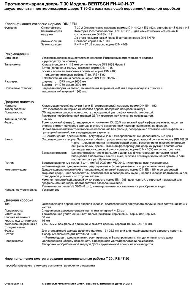 Противопожарная дверь T 30 Модель BERTSCH FH-4/2-H-37 двухстворчатая противопожарная дверь T 30-2 с охватывающей деревянной дверной коробкой
