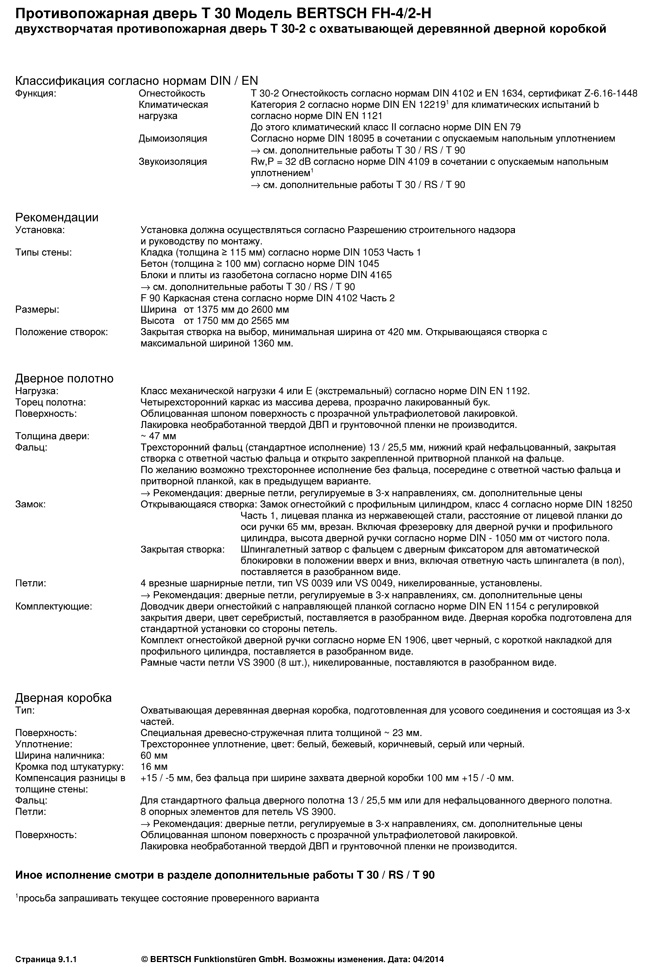 Противопожарная дверь T 30 Модель BERTSCH FH-4/2-H