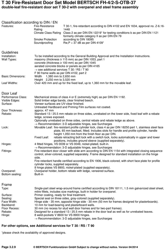 T 30 Fire-Resistant Door Set Model BERTSCH FH-4/2-S-OTB-37 double-leaf fire-resistant door set T 30-2 with overpanel and steel frame assembly