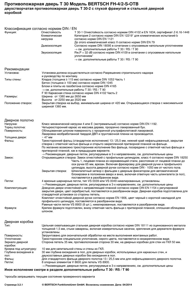 Противопожарная дверь T 30 Модель BERTSCH FH-4/2-S-OTB двухстворчатая противопожарная дверь T 30-2 с глухой фрамугой и стальной дверной коробкой