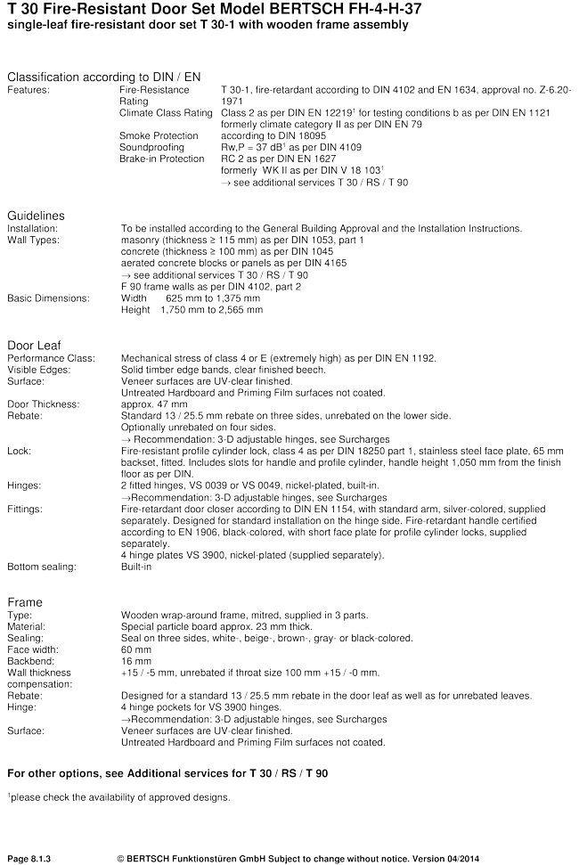 T 30 Fire-Resistant Door Set Model BERTSCH FH-4-H-37 single-leaf fire-resistant door set T 30-1 with wooden frame assembly