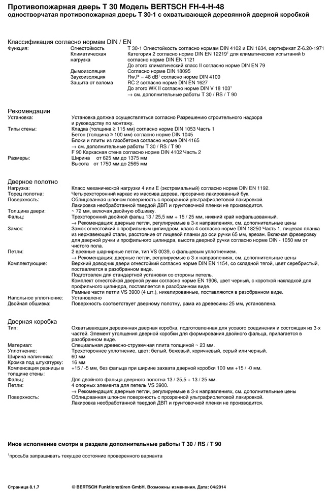 Противопожарная дверь T 30 Модель BERTSCH FH-4-H-48