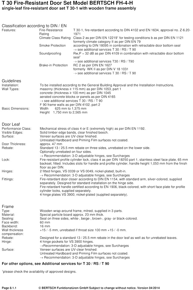 T 30 Fire-Resistant Door Set Model BERTSCH FH-4-H single-leaf fire-resistant door set T 30-1 with wooden frame assembly