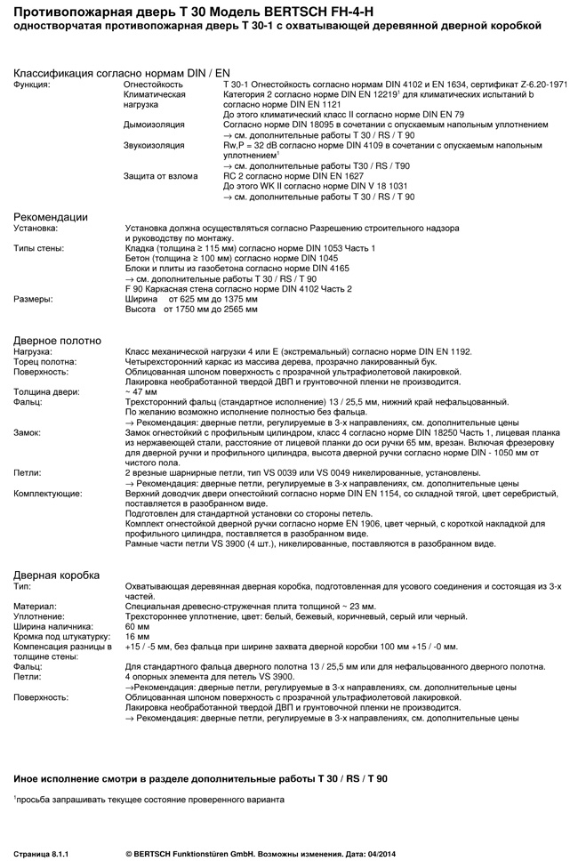 Противопожарная дверь T 30 Модель BERTSCH FH-4-H