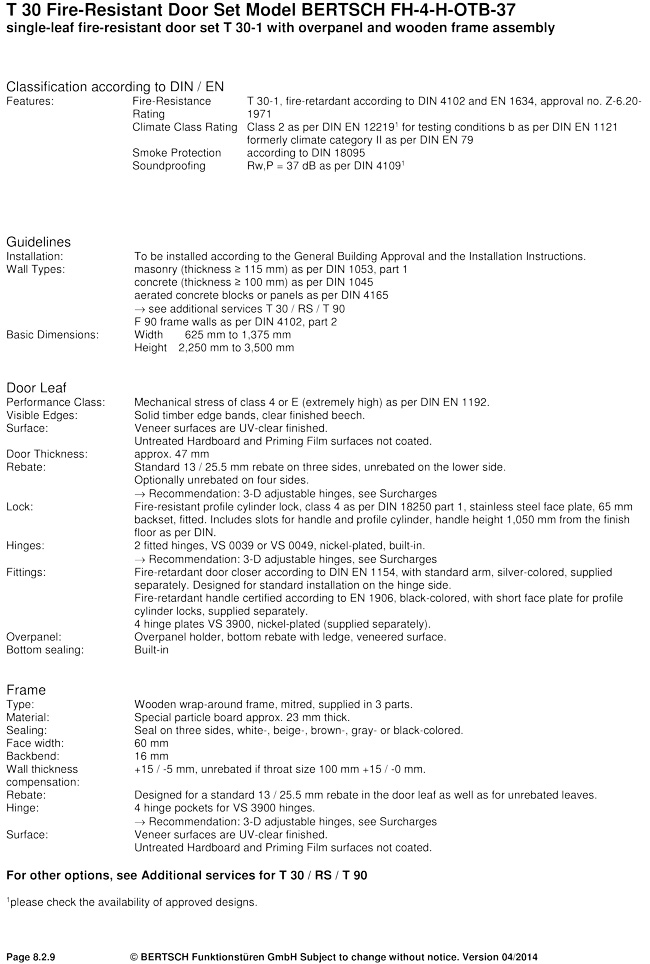 T 30 Fire-Resistant Door Set Model BERTSCH FH-4-H-OTB-37 single-leaf fire-resistant door set T 30-1 with overpanel and wooden frame assembly