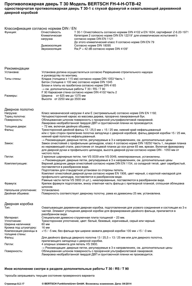Противопожарная дверь T 30 Модель BERTSCH FH-4-H-OTB-42