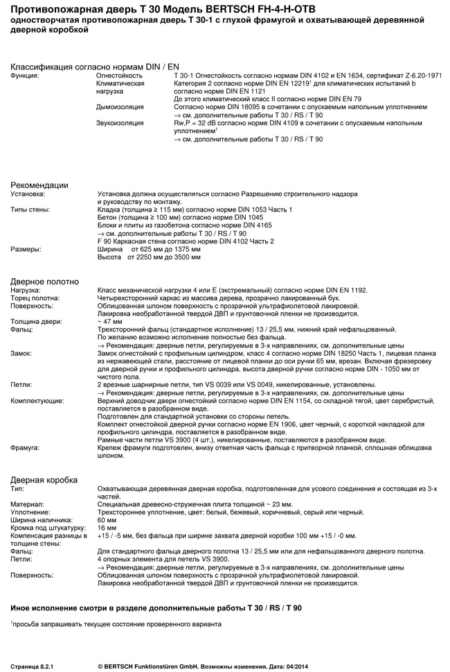 Противопожарная дверь T 30 Модель BERTSCH FH-4-H-OTB
