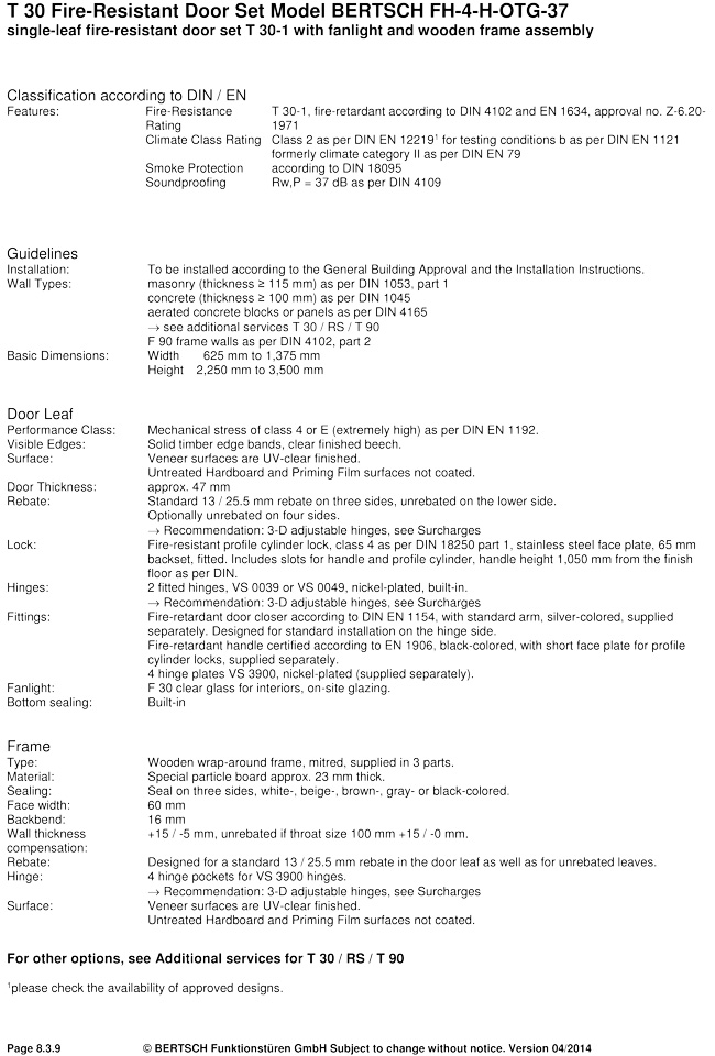 T 30 Fire-Resistant Door Set Model BERTSCH FH-4-H-OTG-37 single-leaf fire-resistant door set T 30-1 with fanlight and wooden frame assembly