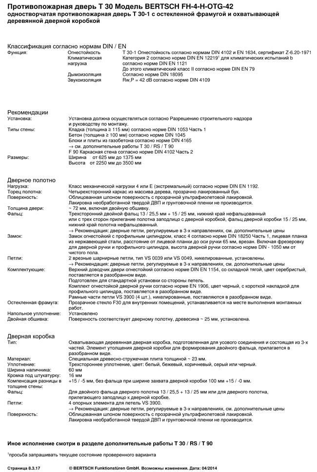 Противопожарная дверь T 30 Модель BERTSCH FH-4-H-OTG-42