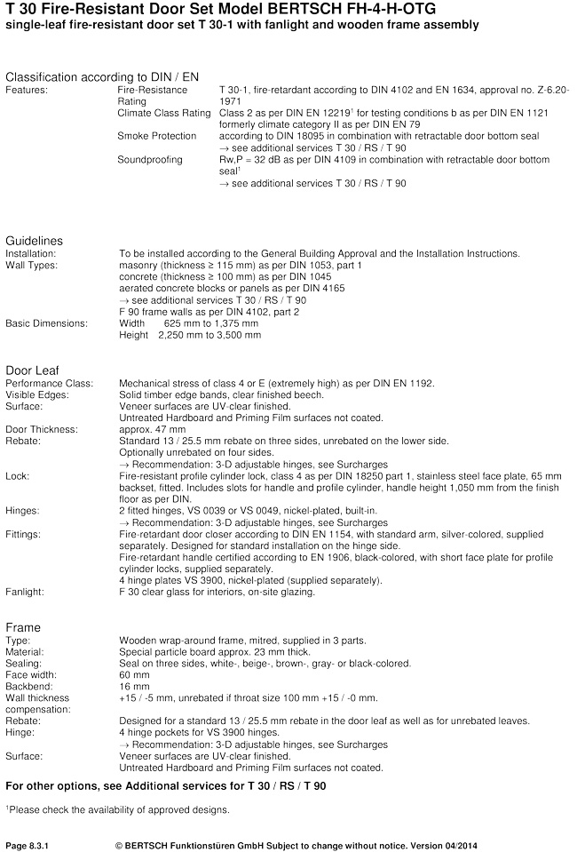 T 30 Fire-Resistant Door Set Model BERTSCH FH-4-H-OTG single-leaf fire-resistant door set T 30-1 with fanlight and wooden frame assembly