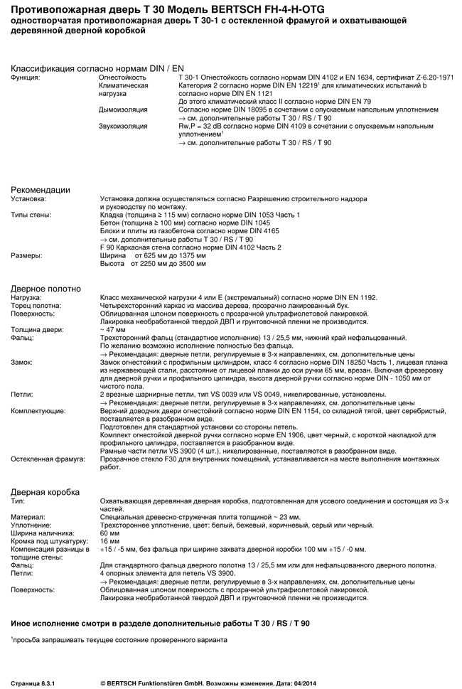 Противопожарная дверь T 30 Модель BERTSCH FH-4-H-OTG
