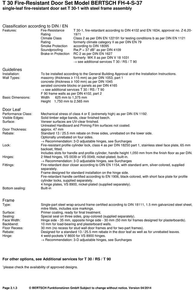 T 30 Fire-Resistant Door Set Model BERTSCH FH-4-S-37 single-leaf fire-resistant door set T 30-1 with steel frame assembly
