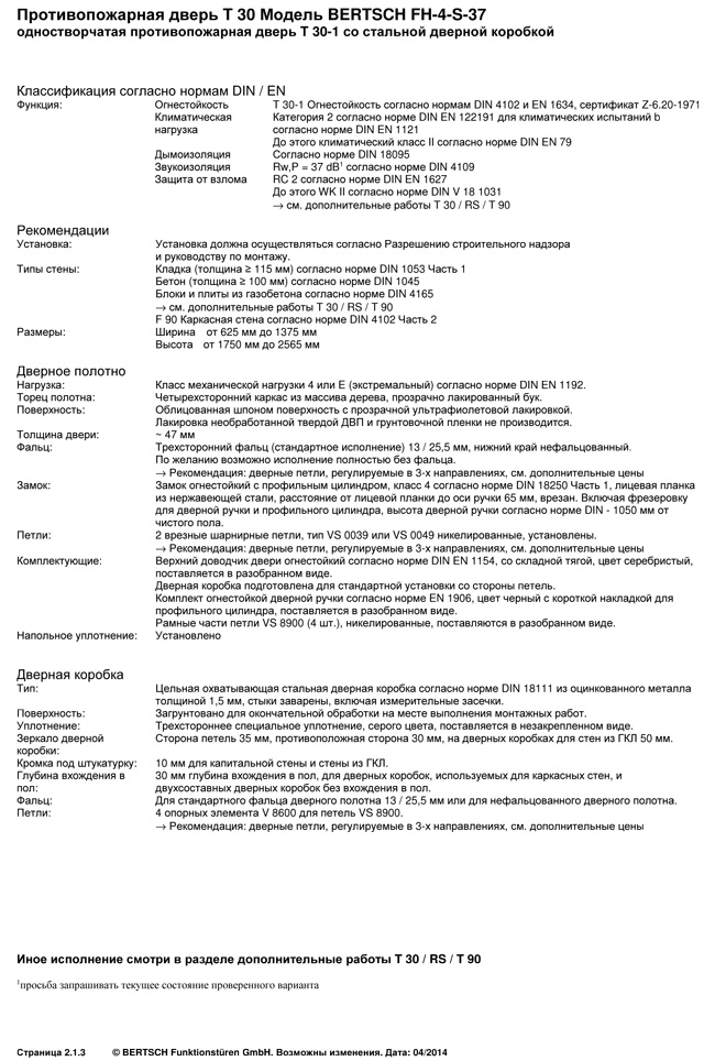 Противопожарная дверь T 30 Модель BERTSCH FH-4-S-37