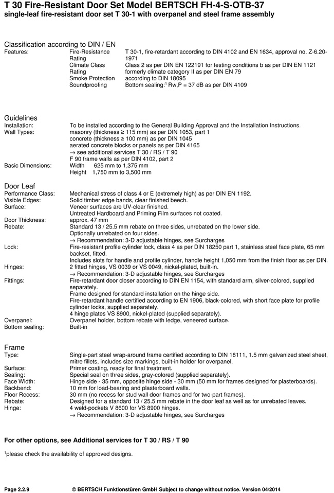 T 30 Fire-Resistant Door Set Model BERTSCH FH-4-S-OTB-37 single-leaf fire-resistant door set T 30-1 with overpanel and steel frame assembly