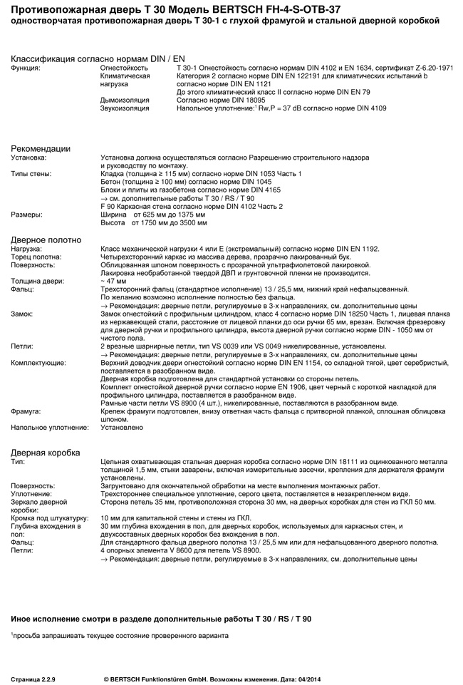 Противопожарная дверь T 30 Модель BERTSCH FH-4-S-OTB-37 одностворчатая противопожарная дверь T 30-1 с глухой фрамугой и стальной дверной коробкой