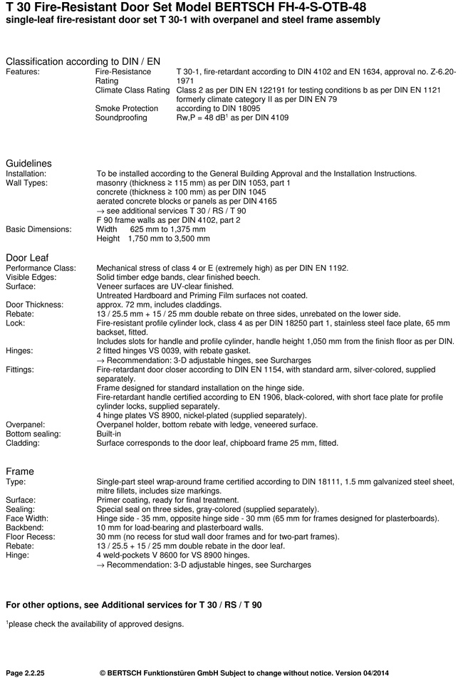 T 30 Fire-Resistant Door Set Model BERTSCH FH-4-S-OTB-48 single-leaf fire-resistant door set T 30-1 with overpanel and steel frame assembly