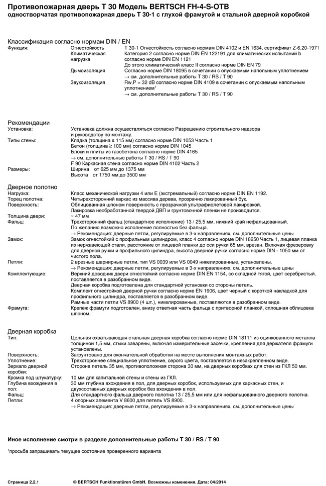 Противопожарная дверь T 30 Модель BERTSCH FH-4-S-OTB