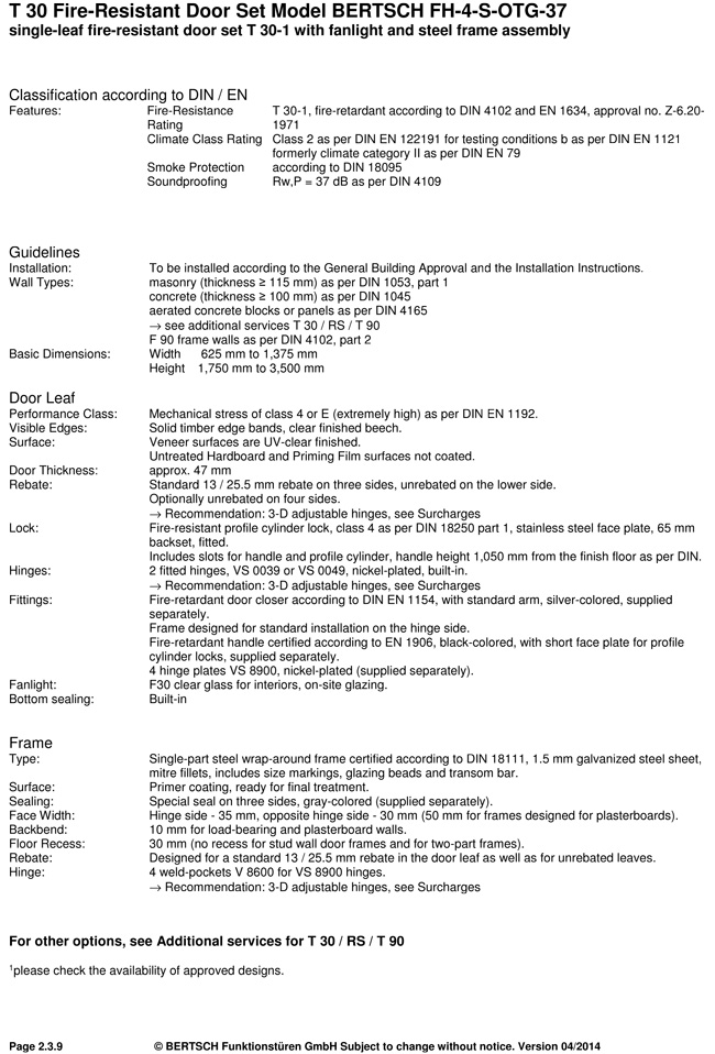 T 30 Fire-Resistant Door Set Model BERTSCH FH-4-S-OTG-37 single-leaf fire-resistant door set T 30-1 with fanlight and steel frame assembly