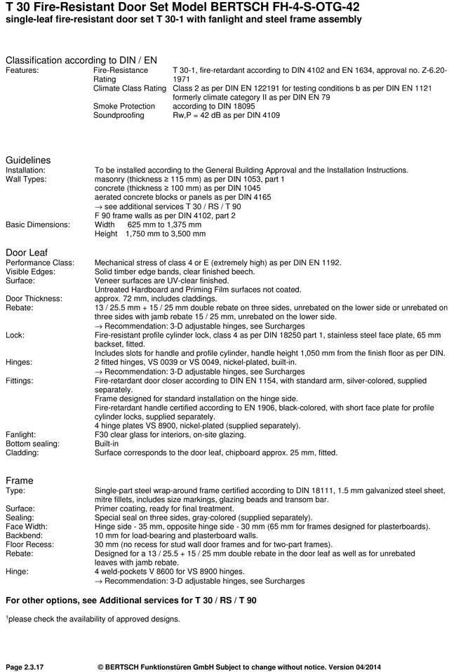 T 30 Fire-Resistant Door Set Model BERTSCH FH-4-S-OTG-42 single-leaf fire-resistant door set T 30-1 with fanlight and steel frame assembly