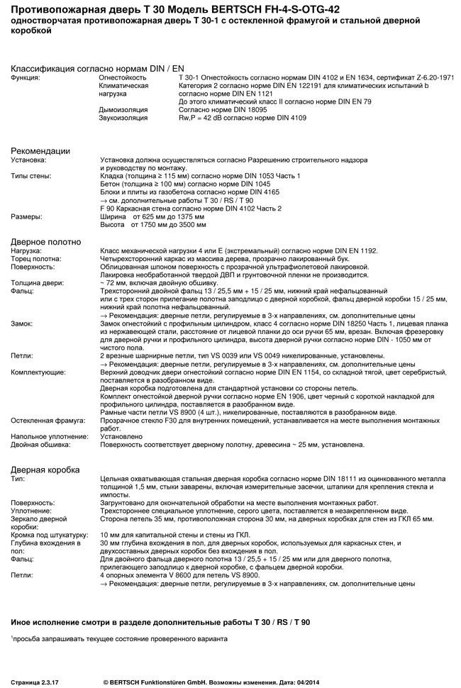 Противопожарная дверь T 30 Модель BERTSCH FH-4-S-OTG-42 одностворчатая противопожарная дверь T 30-1 с остекленной фрамугой и стальной дверной коробкой