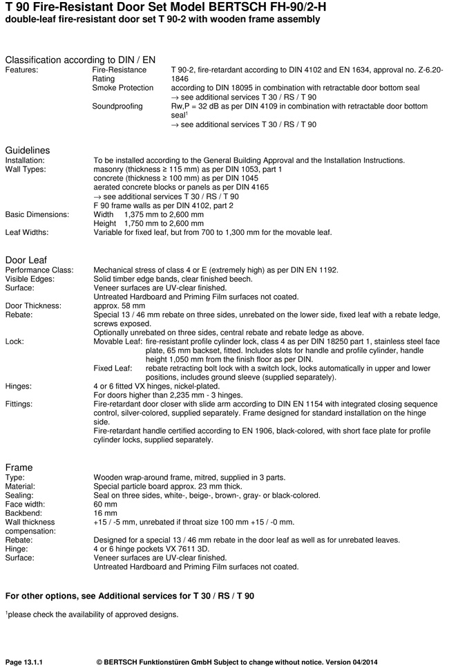 T 90 Fire-Resistant Door Set Model BERTSCH FH-90/2-H double-leaf fire-resistant door set T 90-2 with wooden frame assembly