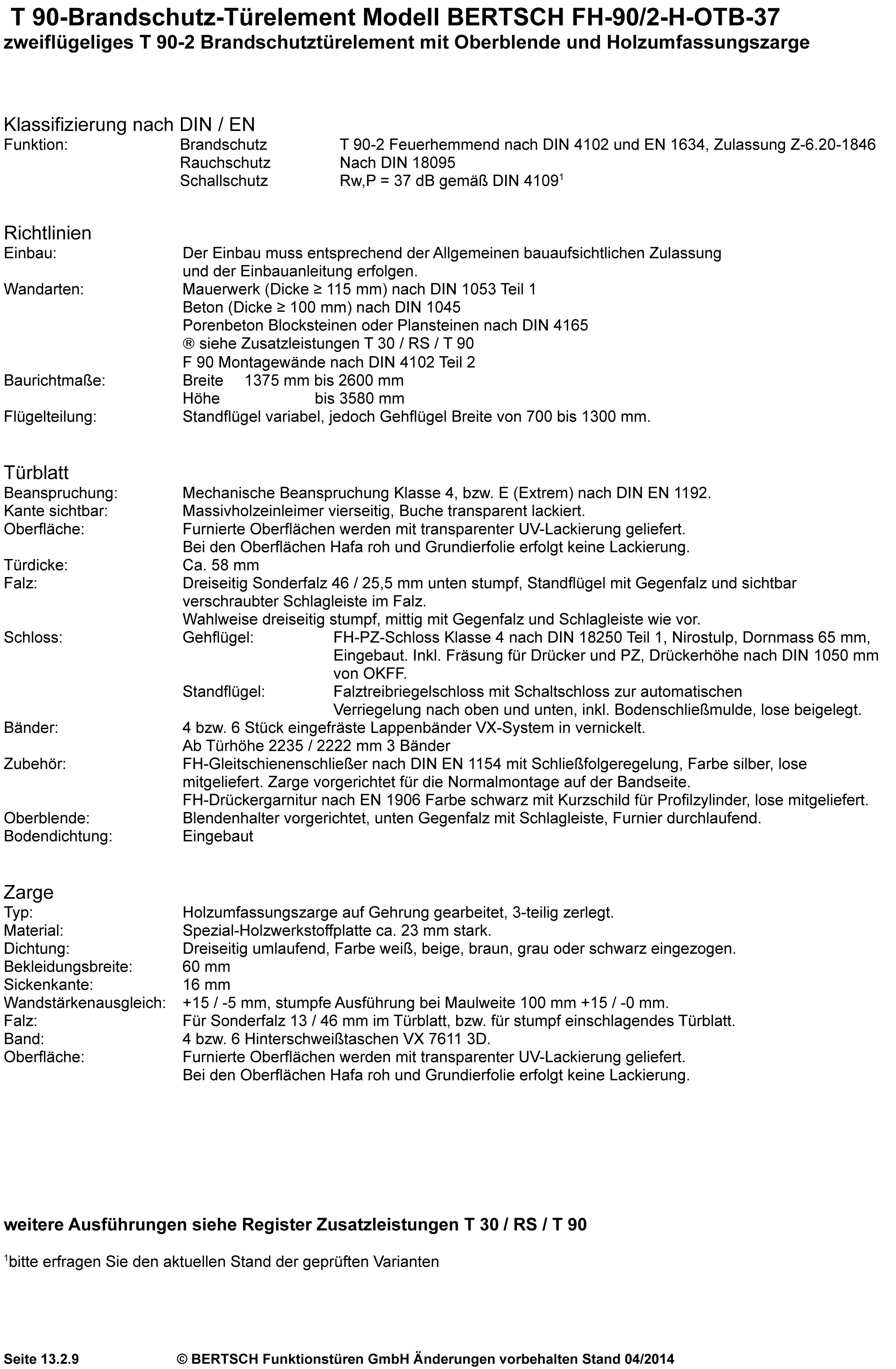 Modell Bertsch FH-90/2-H-OTB-37 zweiflügeliges T 90-2 Brandschutztürelement mit Oberblende und Holzumfassungszarge