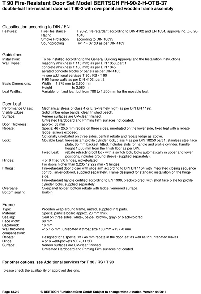 T 90 Fire-Resistant Door Set Model BERTSCH FH-90/2-H-OTB-37 double-leaf fire-resistant door set T 90-2 with overpanel and wooden frame assembly