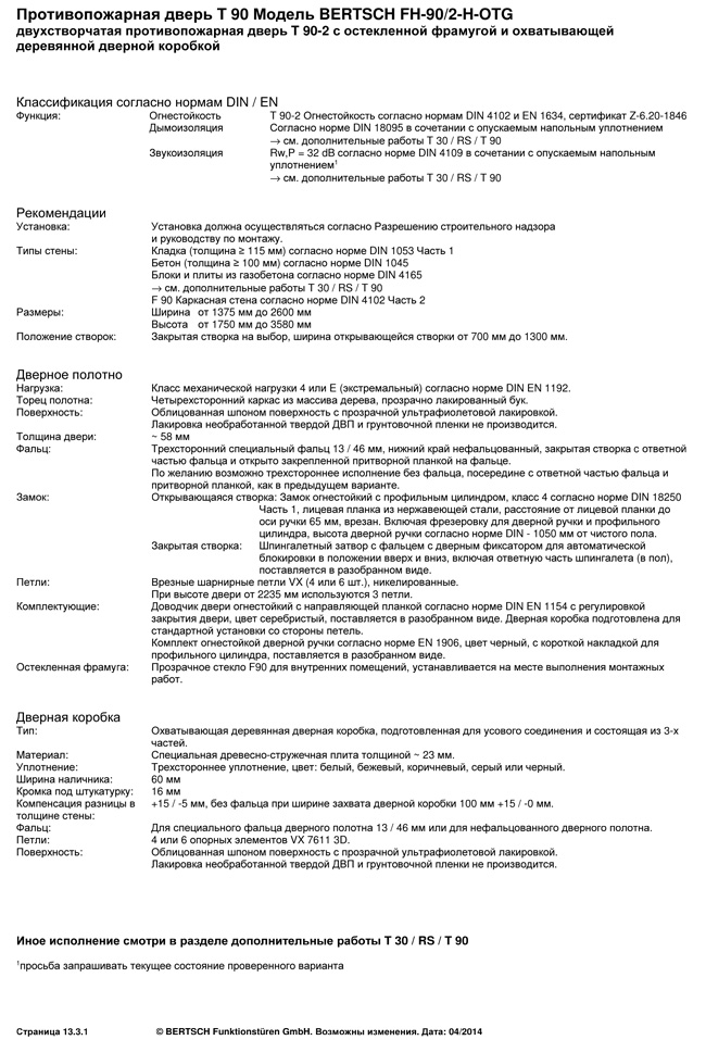 Противопожарная дверь T 90 Модель BERTSCH FH-90/2-H-OTG