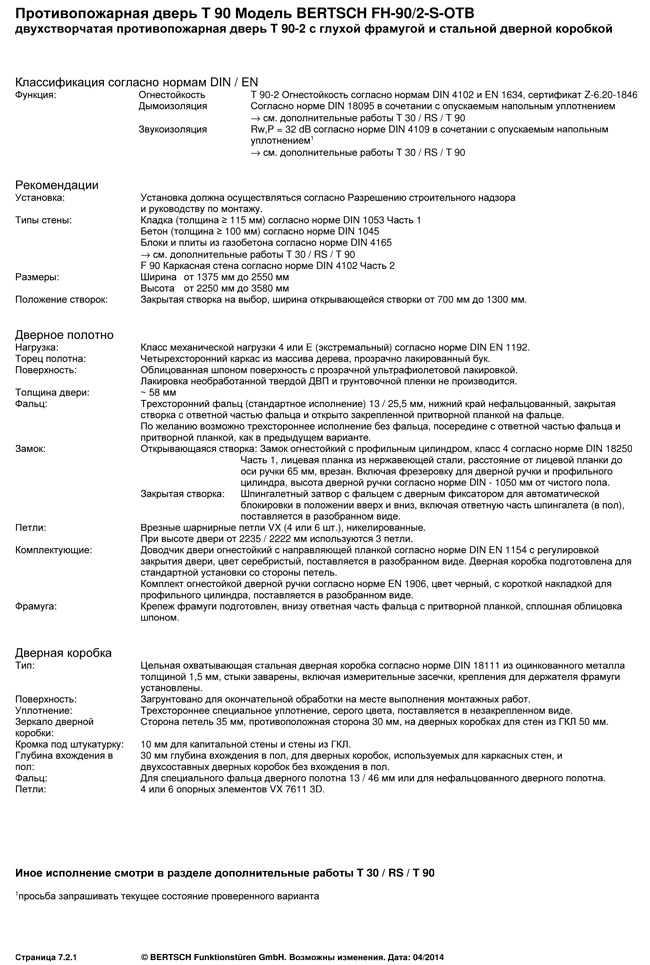 Противопожарная дверь T 90 Модель BERTSCH FH-90/2-S-OTB двухстворчатая противопожарная дверь T 90-2 с глухой фрамугой и стальной дверной коробкой
