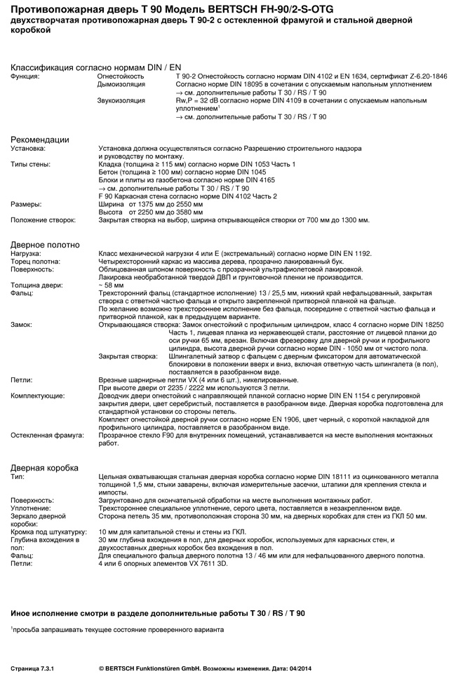 Противопожарная дверь T 90 Модель BERTSCH FH-90/2-S-OTG двухстворчатая противопожарная дверь T 90-2 с остекленной фрамугой и стальной дверной коробкой