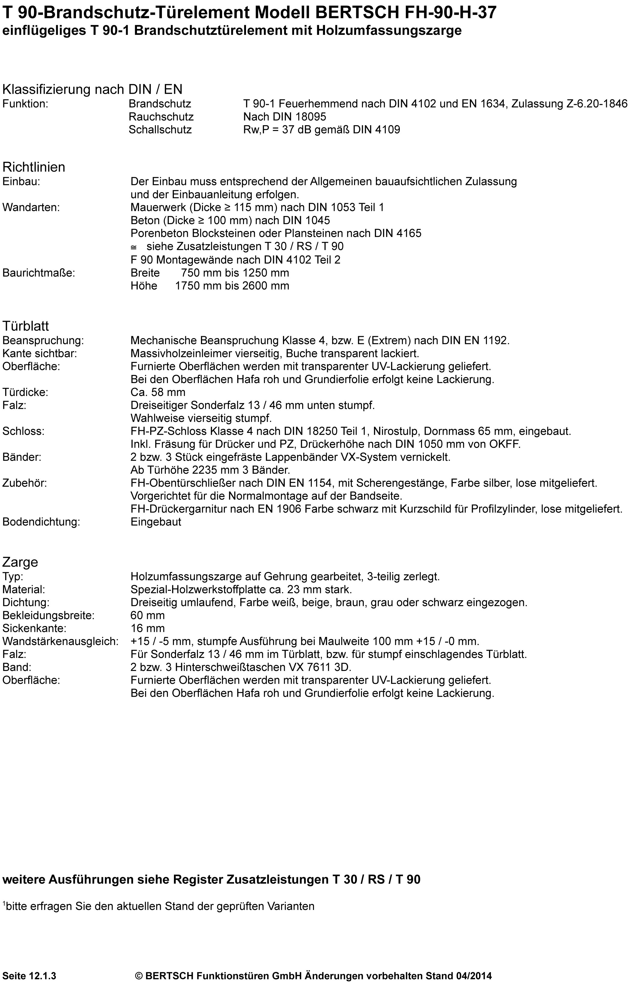 einflügeliges T 90-1 Brandschutztürelement mit Holzerfassungszarge