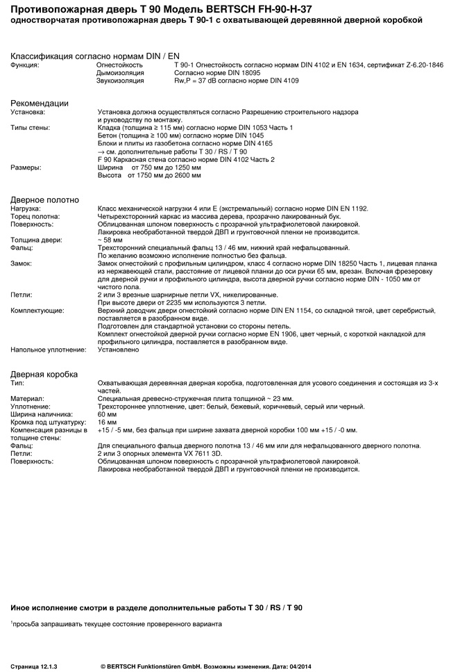 Противопожарная дверь T 90 Модель BERTSCH FH-90-H-37