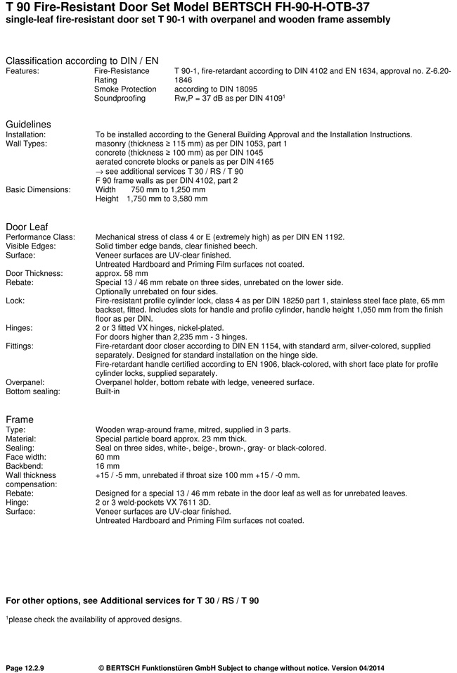 T 90 Fire-Resistant Door Set Model BERTSCH FH-90-H-OTB-37 single-leaf fire-resistant door set T 90-1 with overpanel and wooden frame assembly