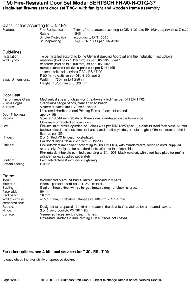 T 90 Fire-Resistant Door Set Model BERTSCH FH-90-H-OTG-37 single-leaf fire-resistant door set T 90-1 with fanlight and wooden frame assembly