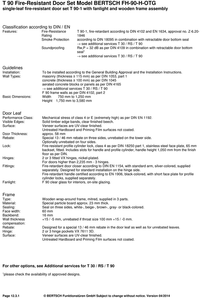 T 90 Fire-Resistant Door Set Model BERTSCH FH-90-H-OTG single-leaf fire-resistant door set T 90-1 with fanlight and wooden frame assembly