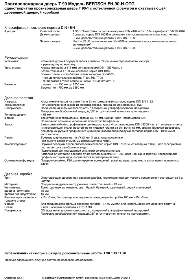 Противопожарная дверь T 90 Модель BERTSCH FH-90-H-OTG