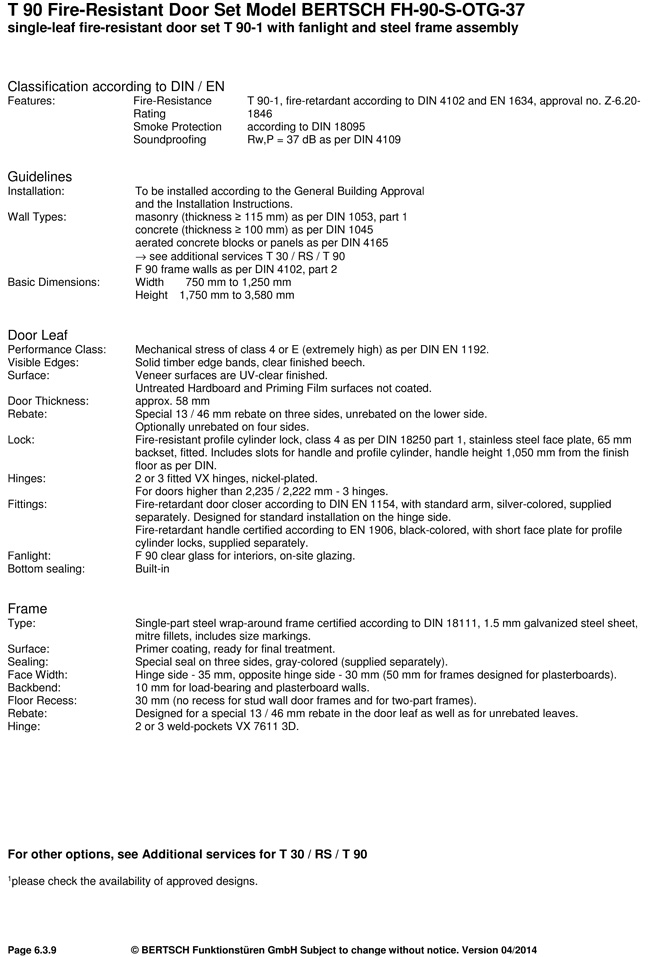 T 90 Fire-Resistant Door Set Model BERTSCH FH-90-S-OTG-37 single-leaf fire-resistant door set T 90-1 with fanlight and steel frame assembly