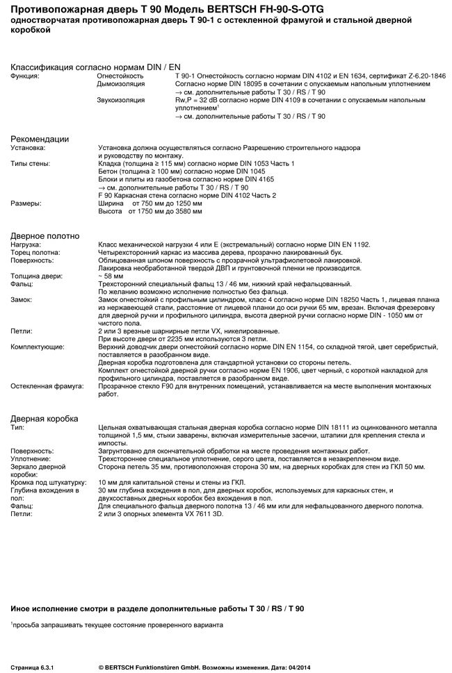 Противопожарная дверь T 90 Модель BERTSCH FH-90-S-OTG одностворчатая противопожарная дверь T 90-1 с остекленной фрамугой и стальной дверной коробкой