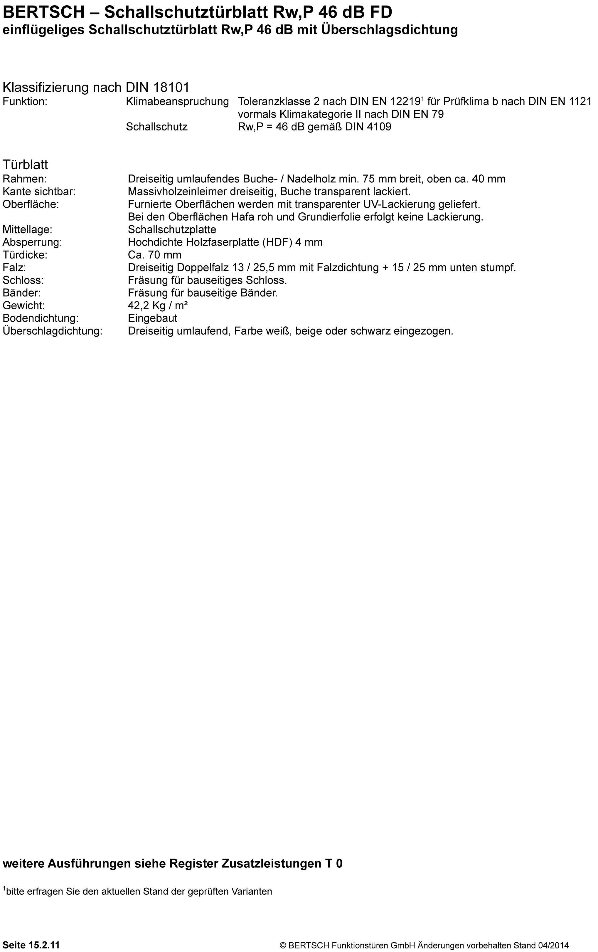 Schallschutztürblatt Rw,P 46 dB FD einflügeliges Schallschutztürblatt Rw,P 46 dB mit Überschlagsdichtung