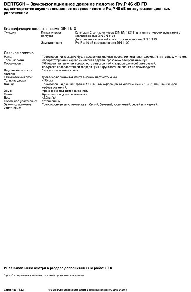BERTSCH – Звукоизоляционное дверное полотно Rw,P 46 dB FD одностворчатое звукоизоляционное дверное полотно Rw,P 46 dB со звукоизоляционным уплотнением