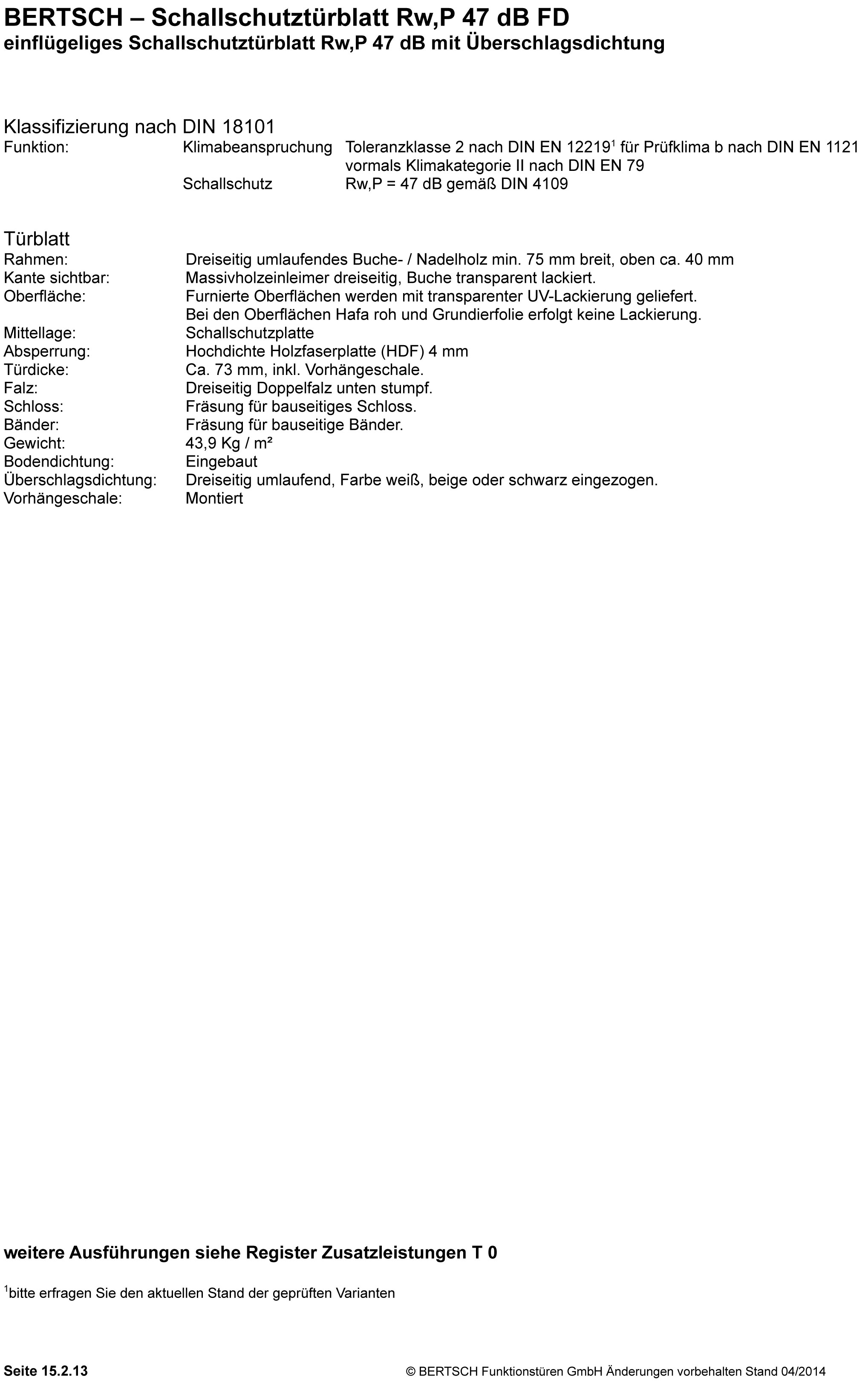 Schallschutztürblatt Rw,P 47 dB FD einflügeliges Schallschutztürblatt Rw,P 47 dB mit Überschlagsdichtung