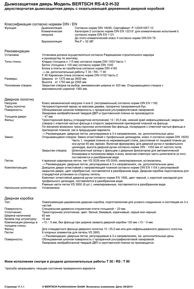 Дымозащитная дверь Модель BERTSCH RS-4/2-H-32