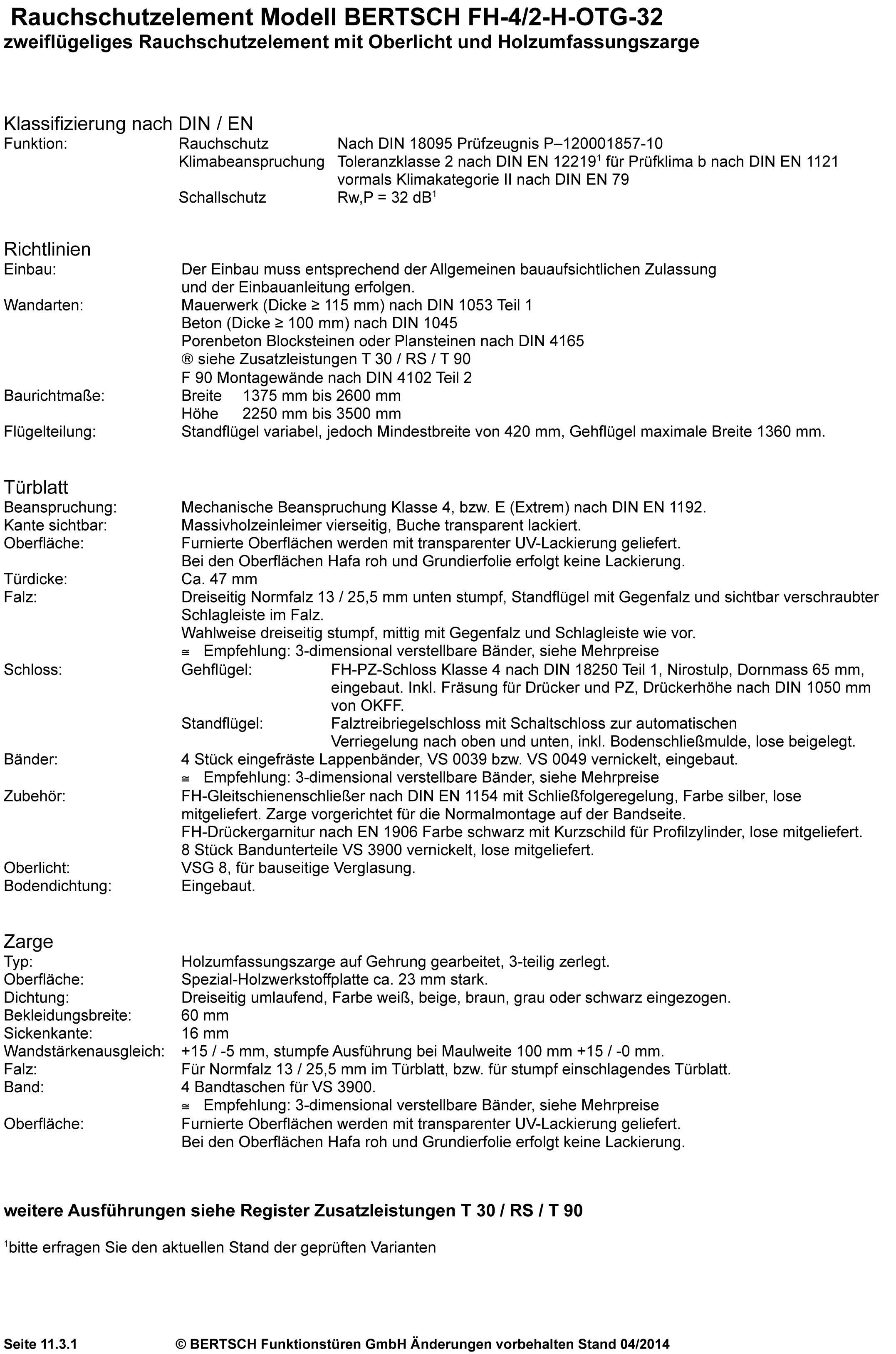Modell Bertsch RS-4/2-H-OTG-32 zweiflügeliges Rauchschutzelement mit Oberlicht und Holzumfassungszarge