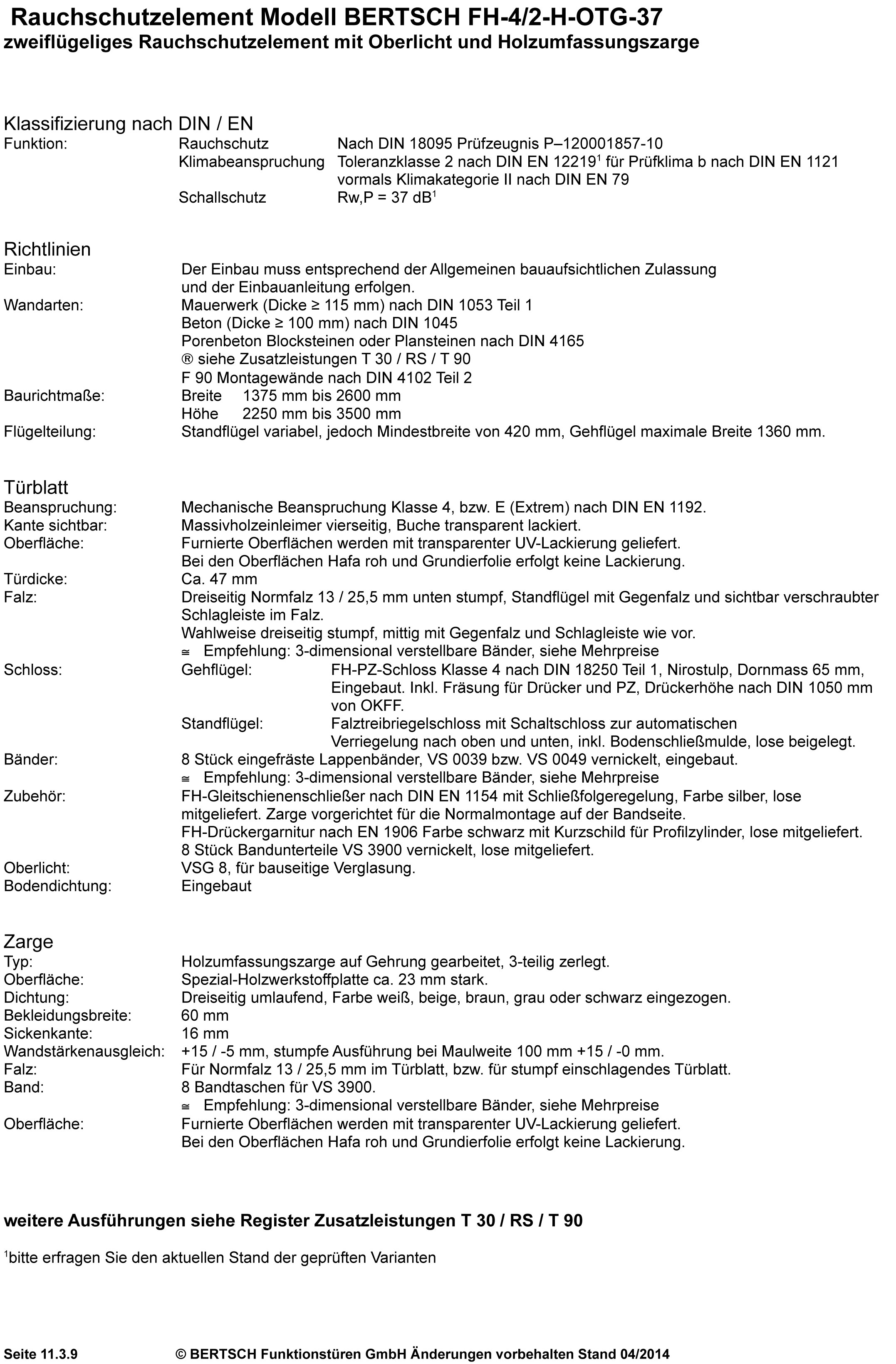 Modell Bertsch RS-4/2-H-OTG-37 zweiflügeliges Rauchschutzelement mit Oberlicht und Holzumfassungszarge
