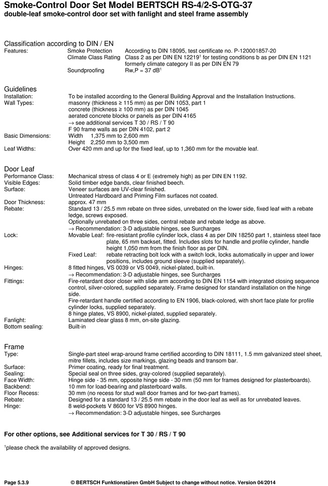 Smoke-Control Door Set Model BERTSCH RS-4/2-S-OTG-37 double-leaf smoke-control door set with fanlight and steel frame assembly