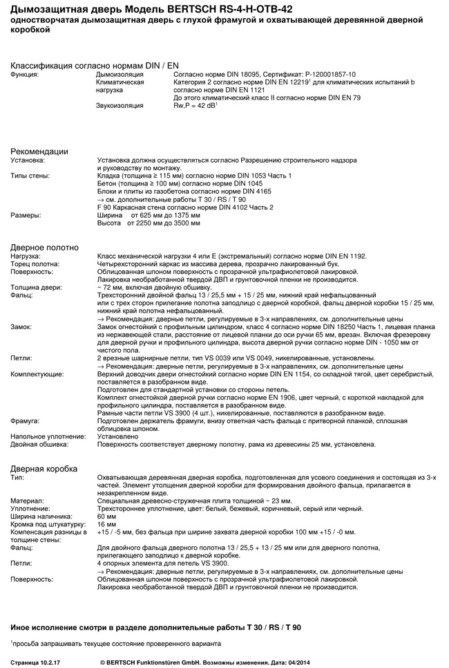Дымозащитная дверь Модель BERTSCH RS-4-H-OTB-42