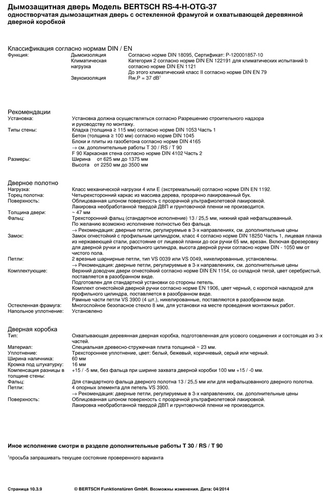 Дымозащитная дверь Модель BERTSCH RS-4-H-OTG-37 одностворчатая дымозащитная дверь с остекленной фрамугой и охватывающей деревянной дверной коробкой