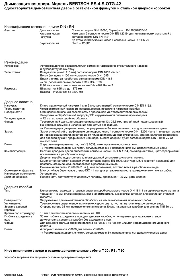 Дымозащитная дверь Модель BERTSCH RS-4-S-OTG-42